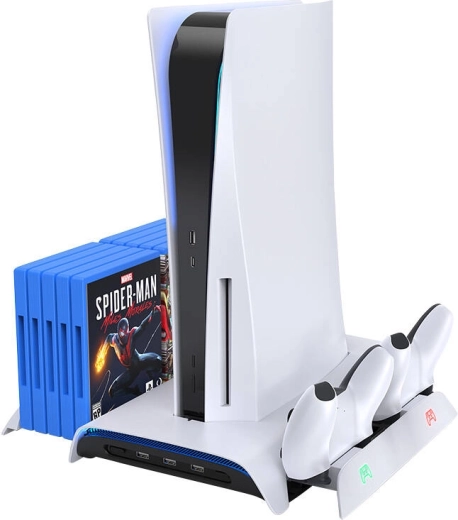 Dio paketa je i docking punjač za dva DualSense kontrolera s brzim punjenjem – puna kapacitet za oko 3 sata. LED indikacija jasno prikazuje status: crvena = puni se, zelena = potpuno napunjeno. RGB pozadinsko osvjetljenje (8 boja) omogućuje prilagodbu izgleda prema raspoloženju ili igri, dok utori za igraće diskove pomažu održati red i brz pristup vašim naslovima.