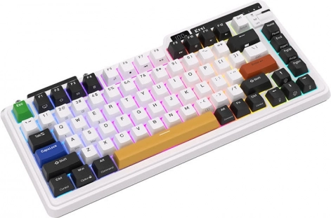 Stilska bežična mehanička tipkovnica Royal Kludge K75 Pro nudi kompaktan raspored s 82 tipke, višebojno RGB pozadinsko osvjetljenje, do 130 sati autonomije baterije i trostruko povezivanje (2,4 GHz, Bluetooth, USB-C). Zahvaljujući hot-swap ležištima lako mijenjate prekidače, anti-ghosting osigurava pouzdanu registraciju pritisaka, a integrirani zaslon pregledno prikazuje stanje baterije. Odličan izbor za posao i igranje.