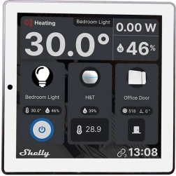 Shelly Wall Display je središnji upravljački panel za pametni dom s 4" zaslonom u boji i Wi‑Fi/Bluetooth povezivanjem. Omogućuje brzo podešavanje temperature, vlažnosti i rasvjete te pregledno prikazuje ključne podatke o kućanstvu. Zahvaljujući funkciji Shelly Smart Control dodatno lako pratite potrošnju energije i otkrivate nepotrebne odljeve.