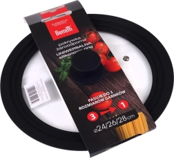 Univerzalni poklopac BERRETTI za promjere 24, 26 i 28 cm kombinira izdržljivo staklo i čvrst silikonski rub za savršeno brtvljenje. Prozirno staklo omogućuje kontrolu kuhanja bez podizanja poklopca, a ergonomska drška osigurava udobno rukovanje. Visoka otpornost na toplinu i široka kompatibilnost s raznim loncima čine ovaj poklopac izvrsnim pomagačem u svakoj kuhinji.
