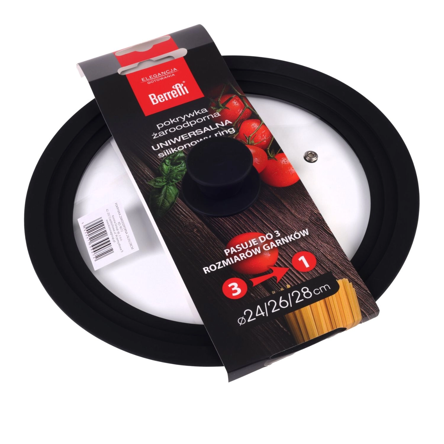 Tražite jedan poklopac za više lonaca? Univerzalni stakleni poklopac BERRETTI odgovara na tri najčešće veličine – 24, 26 i 28 cm. Zahvaljujući kvalitetnom staklu i širokom silikonskom obrubu savršeno brtvi, zadržava toplinu i paru te skraćuje vrijeme kuhanja.