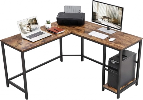 Ovaj kutni računalni stol donosi pametno iskorištavanje prostora i elegantan industrijski izgled. Nudi dovoljno mjesta za monitor, prijenosno računalo, pisač i dodatke, dok čelični okvir i kvalitetna ploča u rustikalno smeđoj jamče dug vijek trajanja. Zahvaljujući podesivim nožicama lako ćete izravnati neravnine poda i održati stabilnost pri radu.