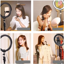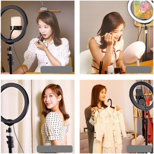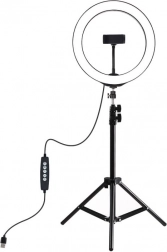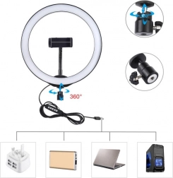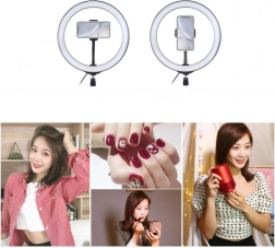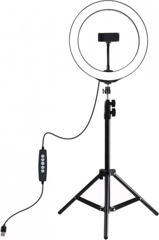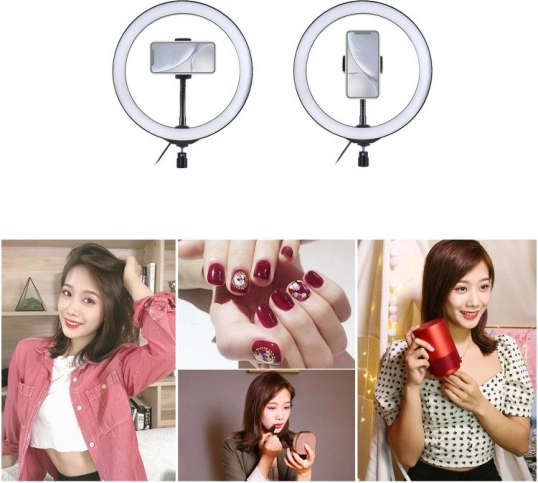 Integrirani držač za pametne telefone širine 5,7–9 cm nalazi se u središtu kruga za ravnomjerno osvjetljenje bez sjena. Napajanje putem USB-a s PC-ja, adaptera ili powerbanka.