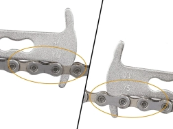 Mjerilo nudi jasno čitljive oznake 0,75 i 1,0 – uz njih lako prepoznajete kada je lanac na granici životnog vijeka i kada je potrebna trenutna zamjena.
