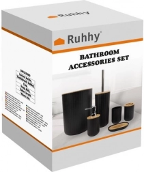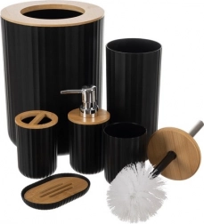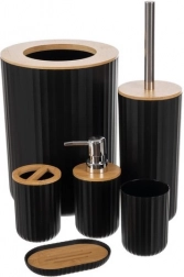 Ovaj 6-dijelni set kupaonskih dodataka spaja mat crne rebraste površine s prirodnim bambusovim akcentima. Zahvaljujući izdržljivoj plastici PP/ABS i elementima od nehrđajućeg čelika idealan je za vlažne prostore, lako se čisti i dugotrajno zadržava svoj elegantan izgled.