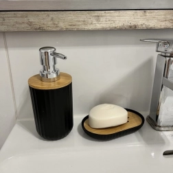 Sapunica s bambusovim umetkom održava sapun suhim, a dozator s metalnom pumpicom idealan je za tekući sapun ili gel.