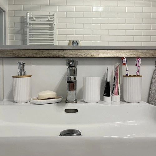Promišljeni detalji poput bambusove umetke u posudici za sapun za brzo ocjeđivanje, kromirane pumpice dozatora te razdjelnika u bambusovom poklopcu čaše za četkice povećavaju svakodnevnu udobnost i higijenu. Kanta sa širokim kružnim otvorom drži vrećicu na mjestu i izgleda elegantno.