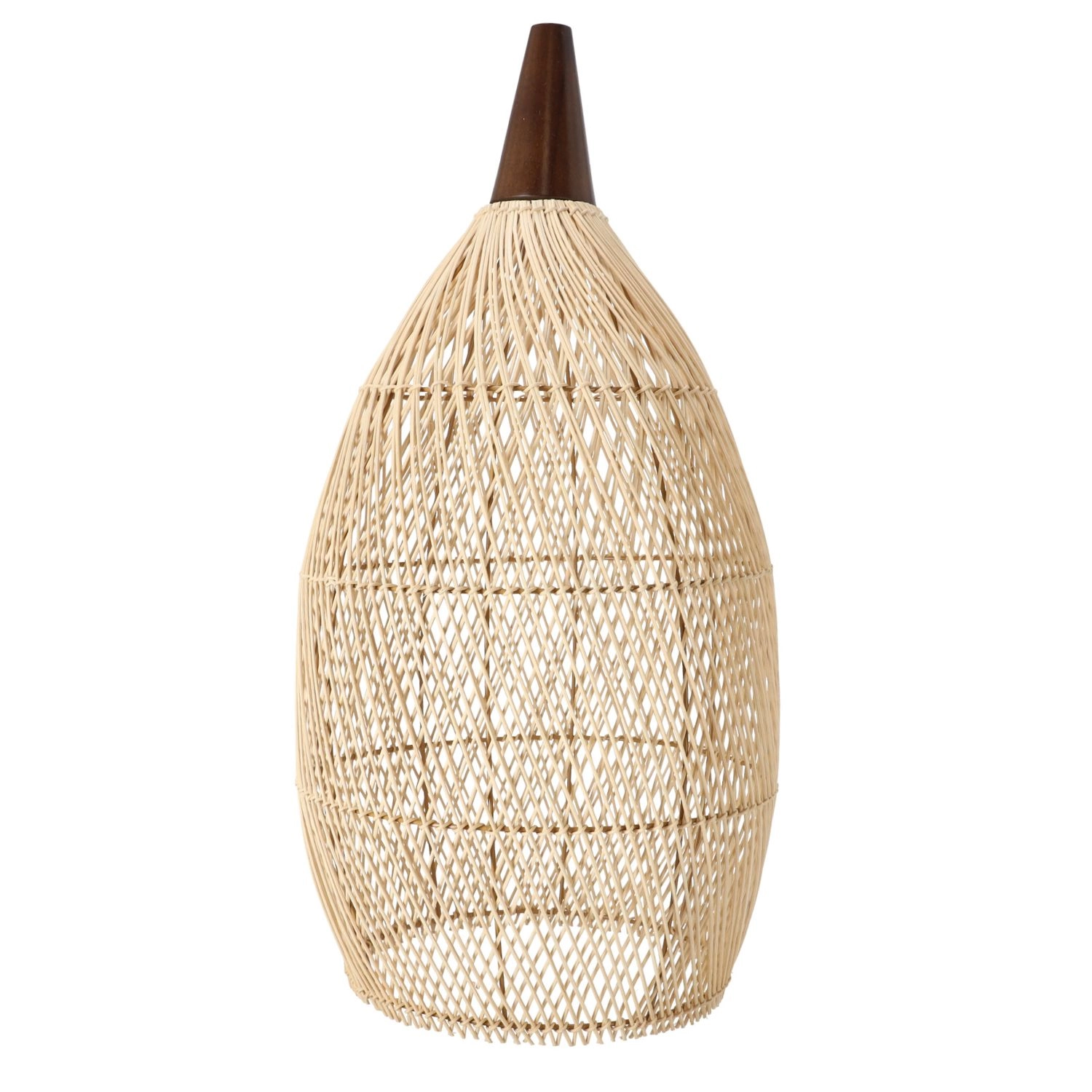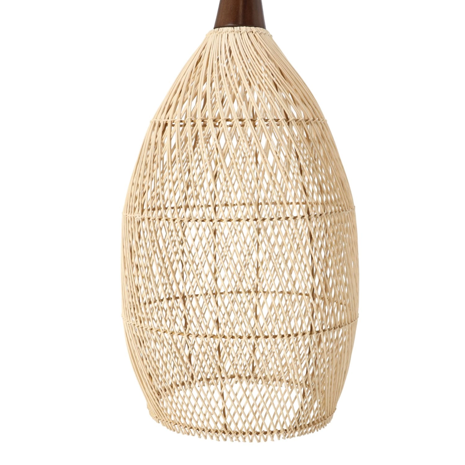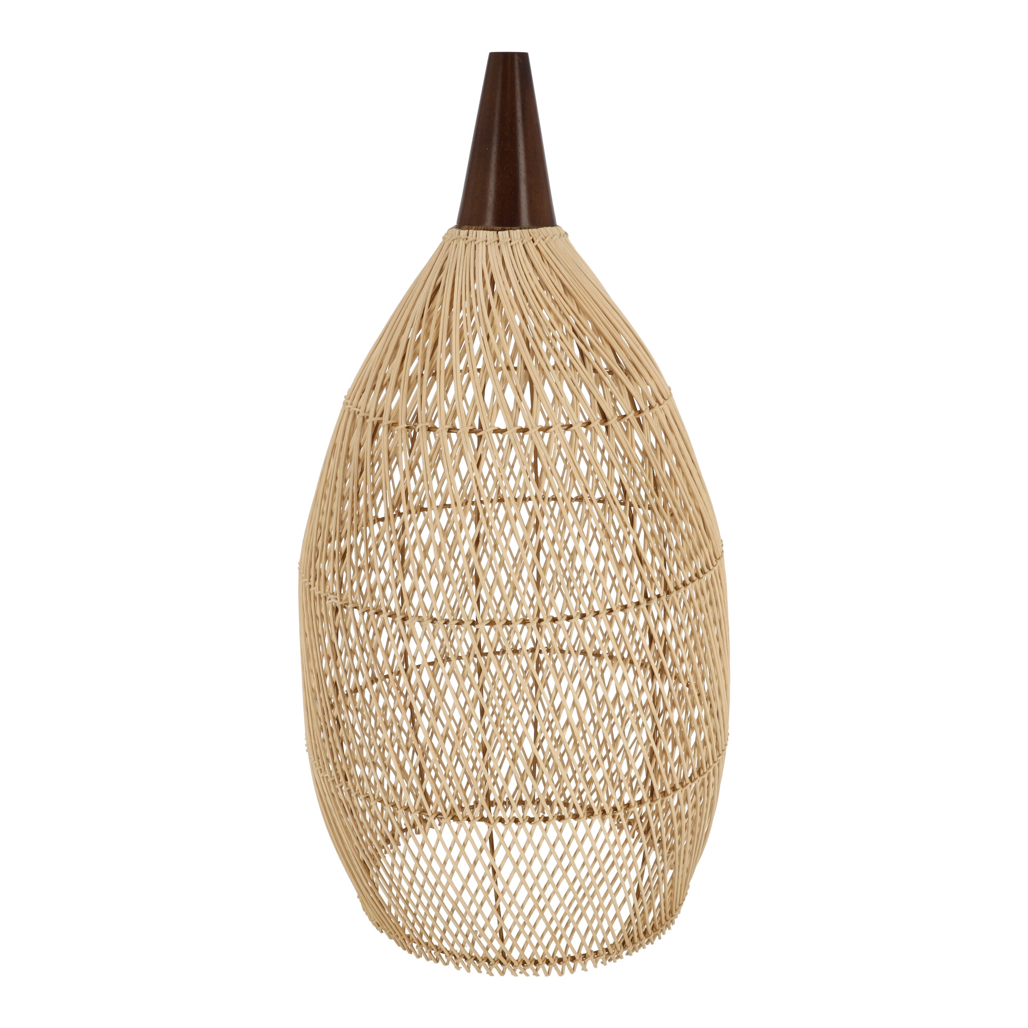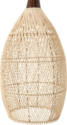 Prirodni ratan u kombinaciji s drvenim vratom stvara lagan i prozračan izgled koji lijepo raspršuje svjetlo i crta dekorativne sjene. Promjer 35 cm i visina 70 cm čine ga upadljivim, ali i dalje skladnim elementom iznad blagovaonskog stola, klub-stolića ili noćnog ormarića.