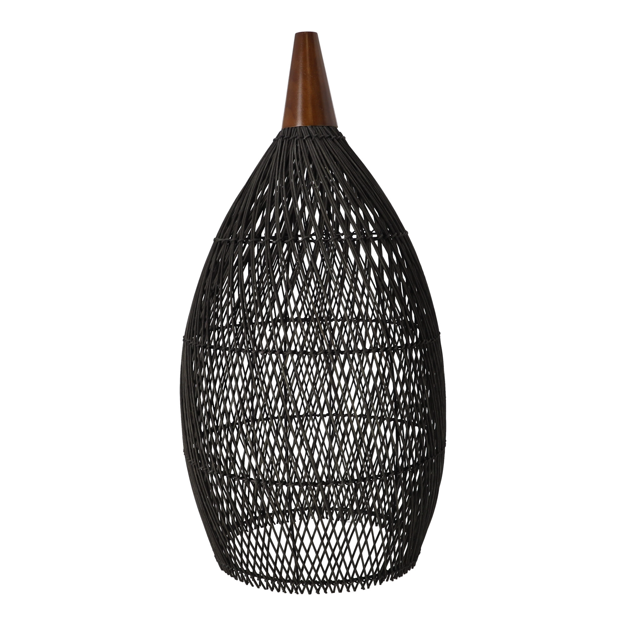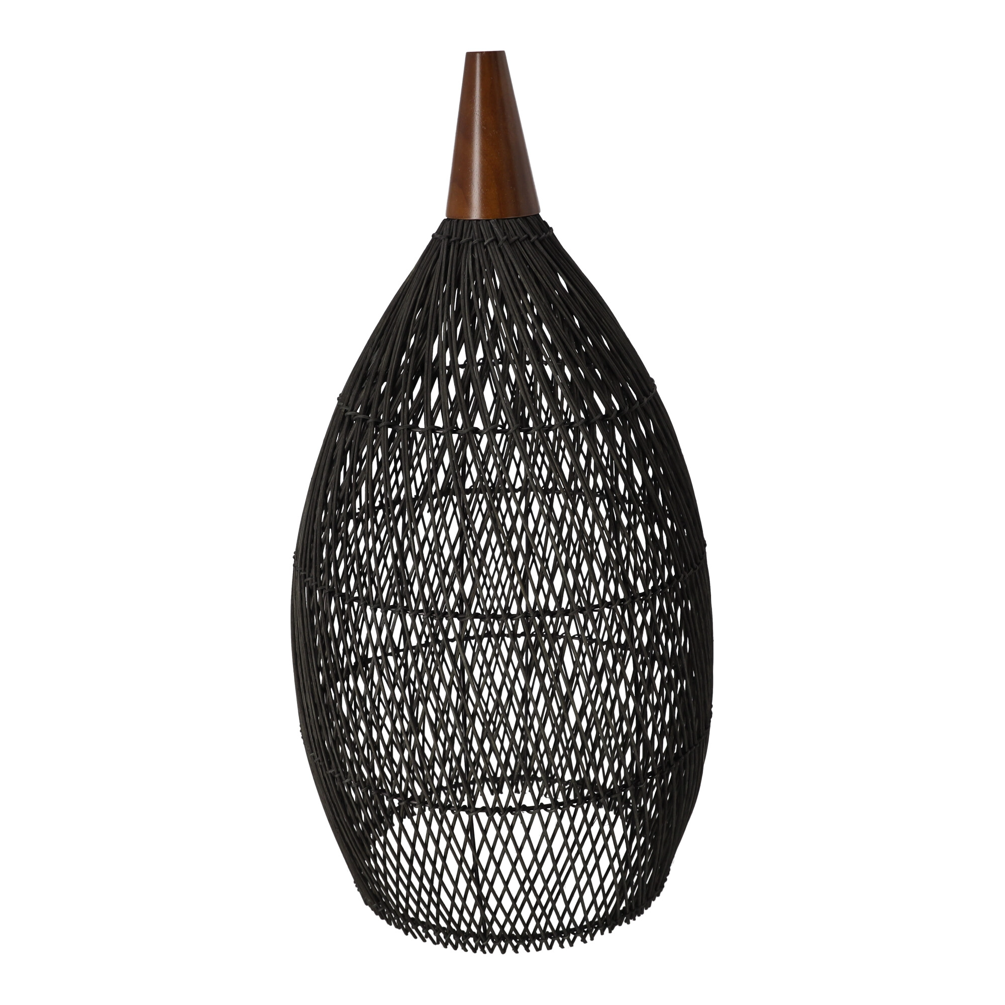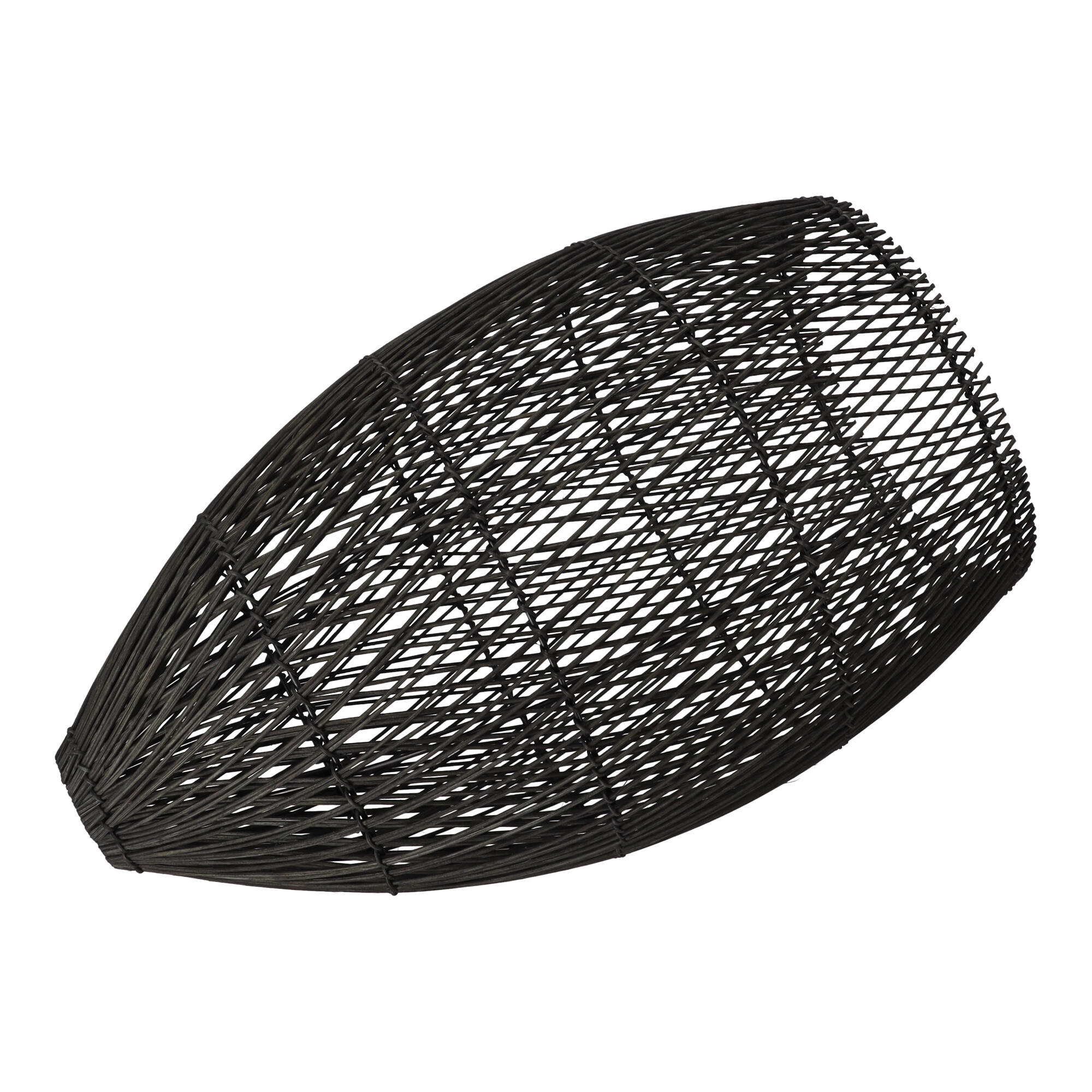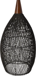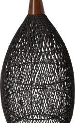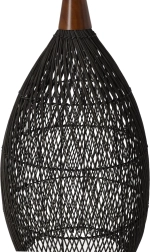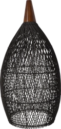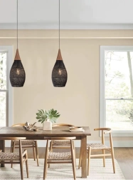 Ova viseća rasvjeta od ratana, promjera 35 cm, spaja autentičnu strukturu prirodnog materijala s modernom crnom izvedbom. Stvara ugodnu, meku svjetlost i postaje dizajnerski akcent iznad blagovaonskog stola, u dnevnoj sobi ili predvorju.