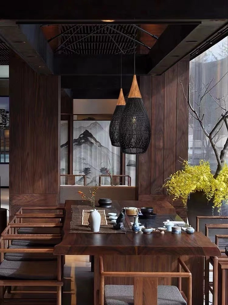 Kombinacija autentične ratanove strukture i drvenih akcenata u crnoj izvedbi prostoru daje toplinu i eleganciju.