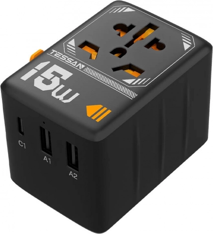 Univerzalni putni adapter TESSAN s izmjenjivim utikačima EU/UK/AU/US i snagom do 2500 W omogućuje sigurno napajanje vaših uređaja diljem svijeta. Ima 2× USB‑A i 1× USB‑C za brzo punjenje do 3 uređaja istovremeno (do 15 W na USB‑C). Kompaktne dimenzije štede prostor u prtljazi, a zamjenjiva osigurač 250 V / 10 A osigurava visoku razinu sigurnosti.