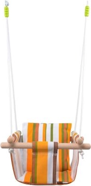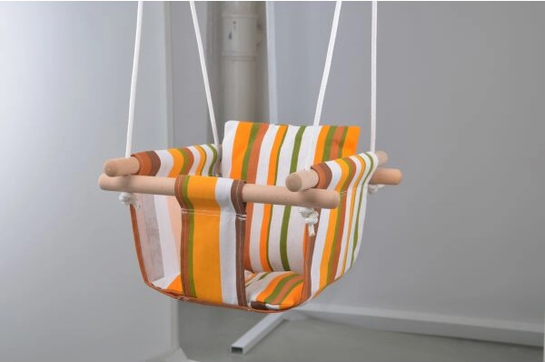 Platnena prugasta ljuljačka. 100% pamuk. Duljina ovjesnih užadi 1,8 m. Poliesterska užad promjera 7 mm. Duljina drvenih oslonaca 40 cm. Nosivost 80 kg.