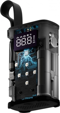 Uređaj je opremljen snažnom litij-ionskom baterijom kapaciteta 2000 mAh, koja nakon punog punjenja omogućuje napuhati do 10 guma. Zahvaljujući širokom rasponu radnih temperatura idealan je za uporabu po svakom vremenu.