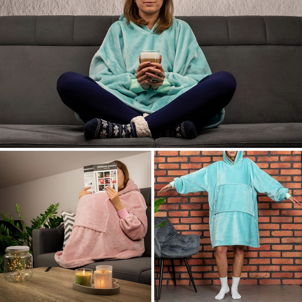 Meka i topla hoodica prevelike veličine. Bluzair - Hoodica deka je topla i iznimno mekana hoodica s kapuljačom koja obavija tijelo poput tvoje omiljene deke. Proizvod 4 u 1: bit će udobna hoodica, topla deka, mekani ogrtač i praktičan jastuk. Nevjerojatno ugodna na dodir i idealna hoodica za one koji se lako smrznu. Rado ćeš je nositi i kod kuće i vani. Odlično služi i kao ženska i kao muška hoodica. Ima jednu univerzalnu veličinu (oversize) - ne moraš razmišljati hoće li biti dobar poklon!
