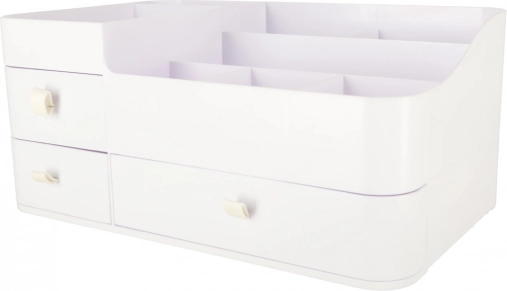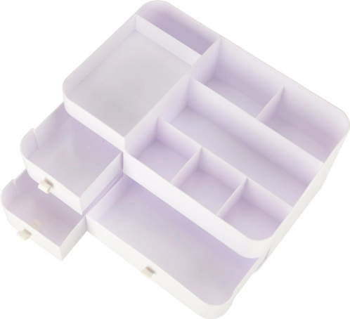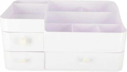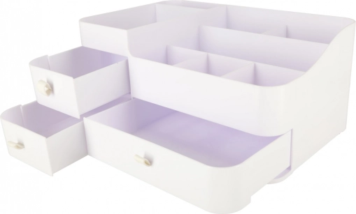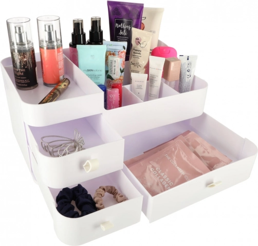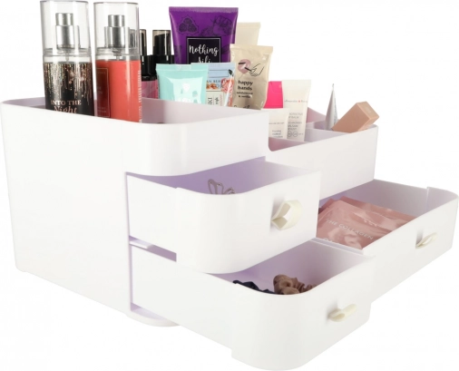 Praktičan bijeli organizator za kozmetiku i nakit s 3 ladice i 7 pretinaca drži sve pregledno na jednom mjestu. Minimalistički dizajn u elegantnoj bijeloj boji pristaje i u kupaonicu i na toaletni stolić te ubrzava jutarnju rutinu zahvaljujući lakom pristupu svim potrepštinama.