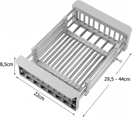 Minimalistički sivi dizajn uklapa se u svaku kuhinju, a zahvaljujući jednostavnom održavanju ocjedna posuda spremna je za uporabu u tren oka. Dimenzije 22 × 8,5 × 29,5–44 cm osiguravaju izvrsnu ravnotežu između kapaciteta i kompaktnosti.