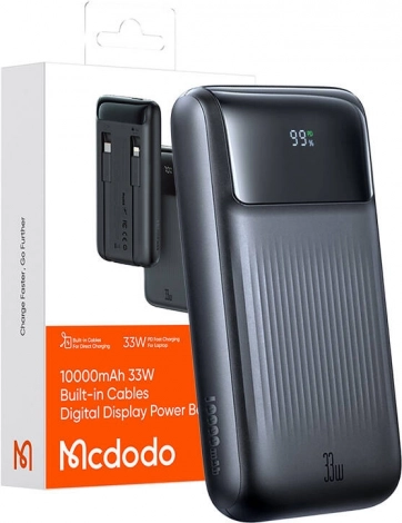 Kompaktna powerbanka Mcdodo 10000 mAh sa snagom 33 W, integriranim kabelima USB‑C i Lightning, podrškom za PD/QC i digitalnim zaslonom. Brza i sigurna.