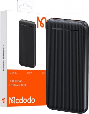 Kompaktna power banka Mcdodo s kapacitetom 10 000 mAh i dvama USB-A izlazima puni dva uređaja istodobno. Nudi snagu do 10,5 W, pregledne LED indikatore stanja i siguran rad zahvaljujući naprednim zaštitama od prenapona, pregrijavanja i kratkog spoja.