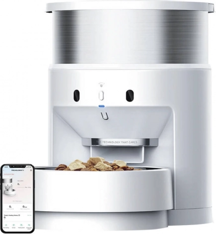 Automatski rotirajuća zdjelica sprječava nakupljanje granula, a napredni mehanizam sprječava začepljenja. Ugrađena vaga prati količinu u zdjelici i omogućuje postavljanje porcija od 20–100 g. Infracrveni senzor kontinuirano kontrolira zalihu u spremniku kako biste imali sigurnost da je uvijek dovoljno hrane.