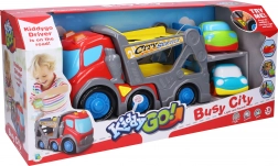 Uz ovaj Kiddy set za vuču djeca će doživjeti mnogo realistične zabave. Vučni kamion s dvije platforme i preklopnom rampom omogućuje lako ukrcavanje priloženih autića, dok svjetlosni i zvučni efekti daju igri autentičnu atmosferu. Zahvaljujući slobodnim kotačima vozila se glatko kreću po podu.