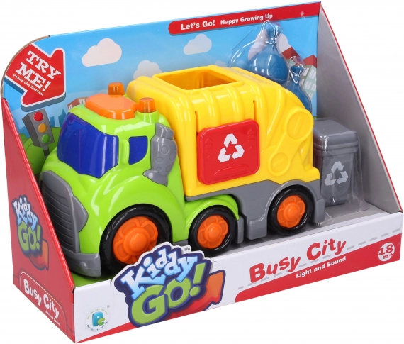 Otkrij zabavu sa smećarskim kamionom Kiddy duljine 19,5 cm, koji nudi svjetlosne i zvučne efekte, pokretna vrata i otvarajuću kantu. Dovoljno je pritisnuti gumb na krovu kabine i igra počinje! U kompletu su i slobodna (freewheel) kola za glatko kretanje te cjelokupna oprema za realistčnu igru.