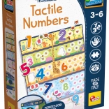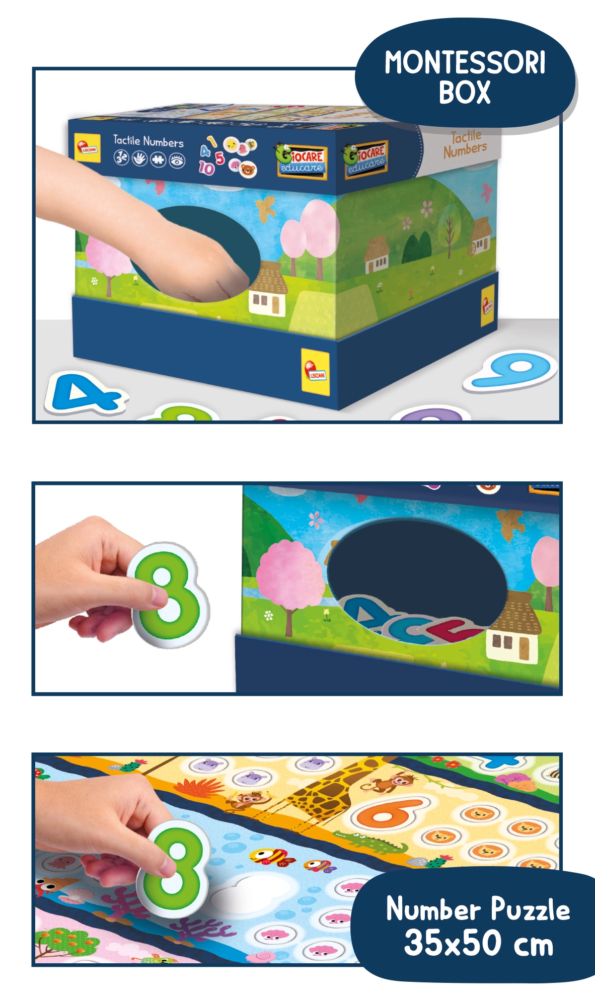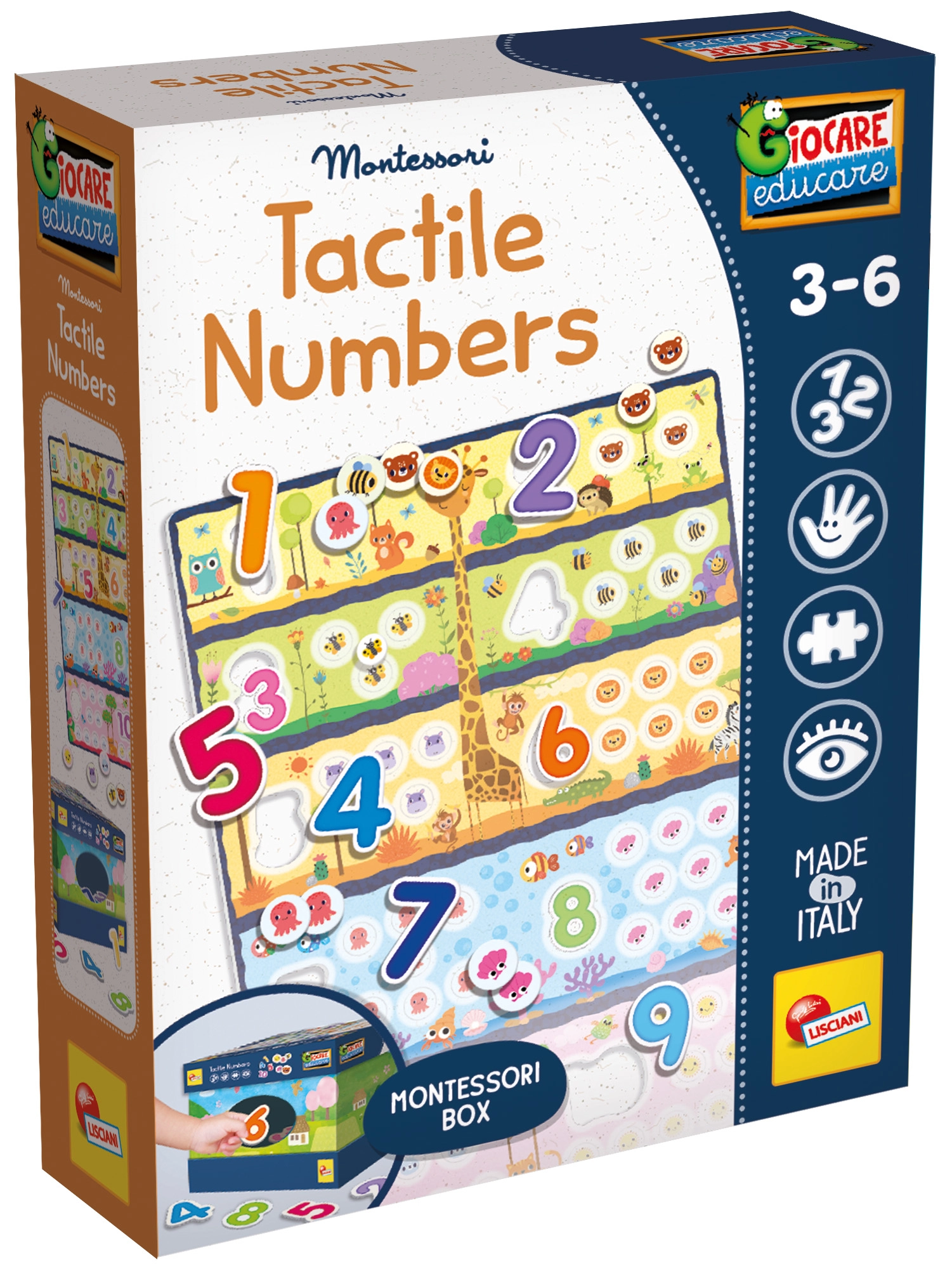 Montessori taktilna brojčana igra dizajnirana je tako da djeca od rane dobi prirodno otkrivaju oblike znamenki dodirom. Dijelovi u obliku brojeva potiču na istraživanje, razvrstavanje i slaganje, čime podupiru koncentraciju, taktilno pamćenje i koordinaciju oko–ruka. Praktična kutija olakšava spremanje i održava red.