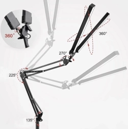 Podesiva ruka omogućuje rotaciju u nekoliko ravnina (360 / 225 / 270 / 135 stupnjeva), što povećava fleksibilnost korištenja. Montaža je moguća uz pomoću stiska ili na postolje, što osigurava univerzalnu primjenu u različitim okruženjima, bilo kod kuće ili u uredu.