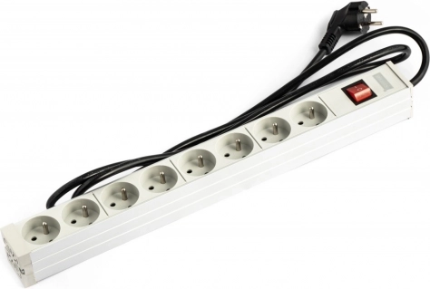 Pouzdana PDU letva za 19" rack ormare nudi osam utičnica Tip E za sigurno napajanje mrežne opreme, poslužitelja i AV tehnike. Robusno aluminijsko tijelo jamči dug vijek trajanja i učinkovito odvođenje topline, dok osvijetljen središnji prekidač olakšava kontrolu napajanja.
