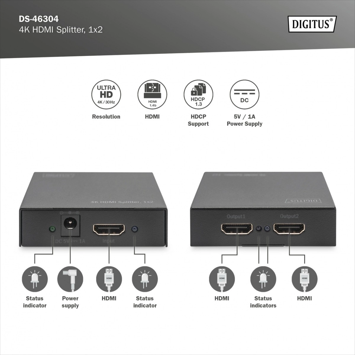 Uz napon 5V/1A jednostavno se napaja, a zahvaljujući LED indikatorima statusa uvijek imate pregled nad vezama. Razdjelnik je također opremljen funkcijom ponavljanja HDCP-a prema monitoru, što osigurava višu razinu sigurnosti prijenosa podataka.