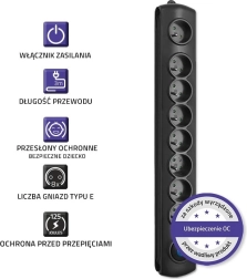 Sigurnost je na prvom mjestu: integrirani varistor štiti od iznenadnih naponskih vrhova, dječje zaštite otežavaju neželjeni kontakt, a negorivi PP materijal povećava otpornost pri svakodnevnoj uporabi. Promišljen dizajn u crnoj boji odlično se uklapa u moderan interijer, omogućuje namatanje suvišnog kabela oko tijela letve te nudi i mogućnost montaže na namještaj.