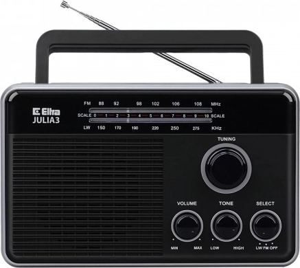 Uživajte u čistom i udobnom slušanju radija s modelom Julia 3. Velika, pregledna skala i ergonomski upravljački elementi osiguravaju jednostavno podešavanje stanice i glasnoće. Zahvaljujući okretnoj teleskopskoj anteni uhvatit ćete stabilan signal, a podešavanje boje zvuka omogućit će vam prilagoditi slušanje vlastitim preferencijama.