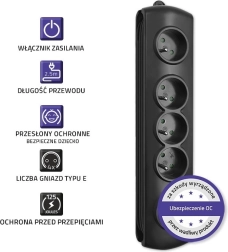 Upravljanje je maksimalno udobno zahvaljujući osvijetljenom nožnom prekidaču Quick Switch – jednim pritiskom isključujete ili uključujete napajanje svih povezanih uređaja. Sigurnost osiguravaju prenaponski elementi (varistor), dječje kapice u svim utičnicama i negoriva PP izvedba.