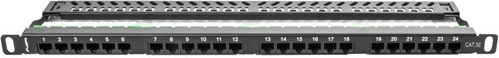 Profesionalni patch panel za 19" rack s 24 RJ-45 portova kategorije Cat.5e i visinom 0.5U. Nudi brzo i pregledno upravljanje kabelima, numerirane portove za laku orijentaciju te IDC/LSA stezaljke kompatibilne s T568A/B za brzu instalaciju. U kompletu je organizer kabela i izdržljivo crno izvedenje RAL9004.