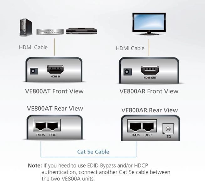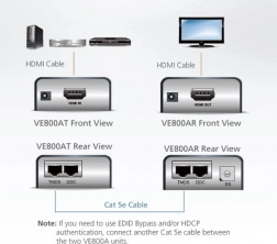 VE800A Produživač HDMI produljuje doseg HDMI monitora do 60 m s prijenosnog HDMI uređaja pomoću samo jednog kabela Cat 5e. VE800A tvrtke ATEN koristi novu tehnologiju koja omogućuje prijenos A/V signala preko jednog Cat 5e kabela. Dostupan je DDC priključak koji omogućuje korištenje EDID monitora povezivanjem dodatnog Cat 5e kabela. Model VE800A podržava HDMI značajke kao što su 3D i Deep Color, pružajući tako izvrsnu kvalitetu slike koju očekujete.