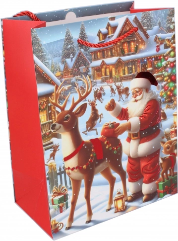 Stilna poklon-vrećica veličine L s dimenzijama 32 × 41,5 × 12 cm idealna je za pakiranje većih darova. Nudi božićni motiv, čvrstu izradu i jednostavno prenošenje. Dostupna u 4 varijante motiva za savršenu blagdansku atmosferu.