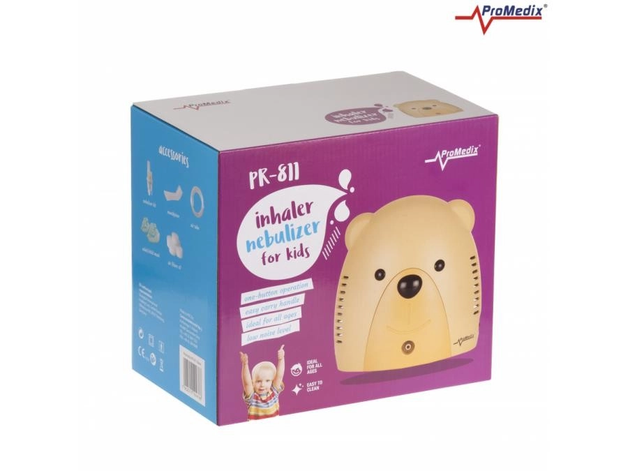 Inhalator/nebulizator Promedix s klipnim kompresorom idealan je za kućno liječenje djece i odraslih. Svojim dizajnom u obliku medvjedića djeci čini proces inhalacije ugodnijim. Prednosti: