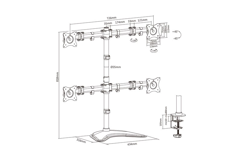 Uz mogućnost rotacije od 360° i vertikalnog podešavanja do 45°, osigurana je maksimalna fleksibilnost za vaše monitore.
