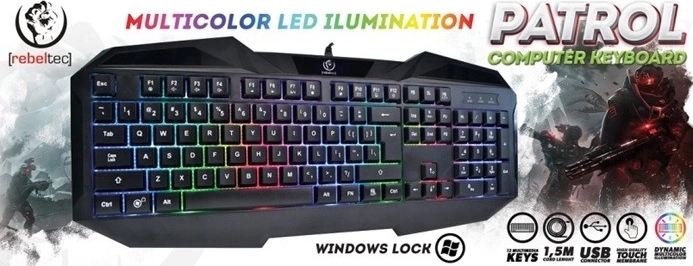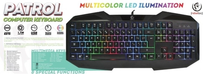 Pozadinski osvijetljena gaming tipkovnica Patrol nudi izvrsno iskustvo igranja zahvaljujući punoj veličini i mogućnosti podešavanja LED osvjetljenja. Opremljena je s 12 multimedijskih tipki i tehnologijom double injection, koja jamči dug vijek trajanja bez trošenja znakova.