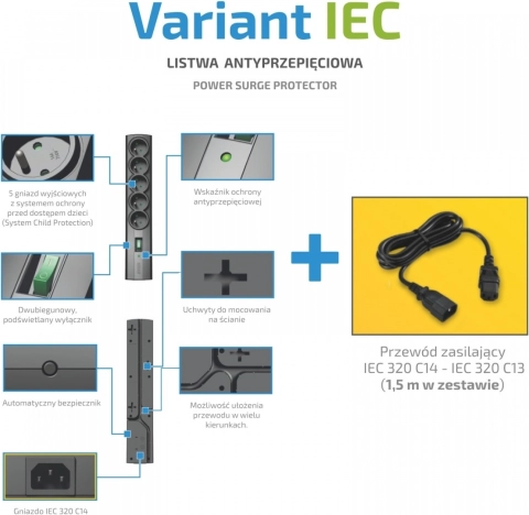 Razdjelnik ima pet uzemljenih utičnica opremljenih dječjom zaštitom koja sprječava pristup dijelovima pod naponom. Ostale značajke uključuju indikator prenaponske zaštite (LED), automatsku osigurač koji omogućuje brzo i jednostavno ponovno uključivanje razdjelnika te dvopolni osvijetljeni prekidač.