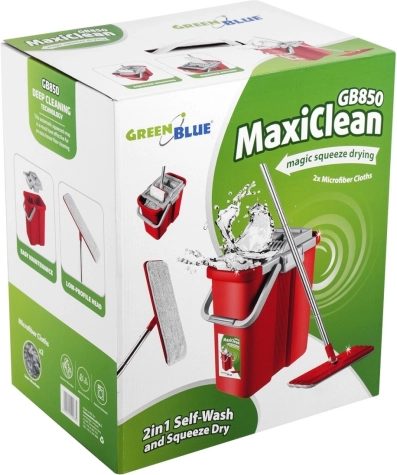 Mop GreenBlue MaxiClean spaja udobnost i učinkovitost: plosnata glava lako dopire do uskih mjesta, elastični zglob prati površinu i omogućuje čišćenje ispod niskog namještaja. Zahvaljujući dvokomornoj kanti WASH/DRY perete i cijedite bez prljanja ruku i nepotrebnog prskanja – podovi ostaju bez tragova.
