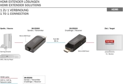 Set HDMI konvertera DIGITUS omogućuje produljenje standardne duljine HDMI kabla na 50 metara uz pomoć jednog mrežnog kabela (Cat 6/6A/7). Zahvaljujući ovom proširenju, možete lako i diskretno premjestiti zaslon na željeno mjesto.