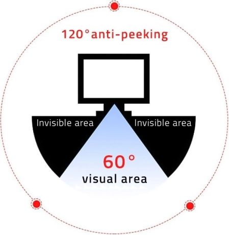 Mikro-žaluzije usmjeravaju svjetlo tako da je slika jasna samo sprijeda; pod bočnim kutovima od cca 30° potamnjuje. Idealno za rad s osjetljivim podacima i GDPR zahtjeve.