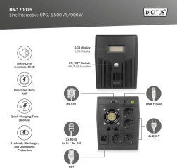 UPS DIGITUS Line‑Interactive je kompaktno i snažno rezervno napajanje za stabilno napajanje osjetljive elektronike. Integrirani AVR automatski izravnava podnapone i prenapone, dok LCD zaslon prikazuje ključne radne vrijednosti. Kapacitet 1500 VA / 900 W i dvije interne baterije 2× 12 V / 9 Ah omogućuju sigurno gašenje i zaštitu podataka pri nestanku.