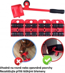 Ovaj kompaktan i funkcionalan set idealan je za kućanstvo, ured i radionicu. Pomoću poluge lako ćete podići namještaj i pod svaki kut postaviti transportne role. Protuklizna površina drži predmet stabilnim, a rotirajuća platforma od 360° omogućuje precizno usmjeravanje bez nepotrebnog opterećivanja leđa.