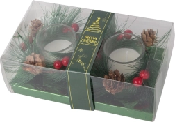Elegantni stakleni svijećnjaci okruženi su umjetnim elementima koji jamče izdržljivost i dugotrajnu ljepotu. Savršeno za svaki interijer, zahvaljujući svom klasičnom izgledu, koji se uklapa u zimsko razdoblje.