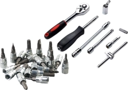Set nasadnih ključeva 1/4" sadrži širok spektar nastavaka, odvijačkih nastavaka i pribora za razne mehaničke radove. Ključevi su izrađeni od kvalitetnog krom-vanadij čelika koji osigurava njihovu otpornost i dug vijek trajanja. Precizna račva s 45 zubi omogućuje glatko korištenje i jednostavnu manipulaciju u ograničenim prostorima.