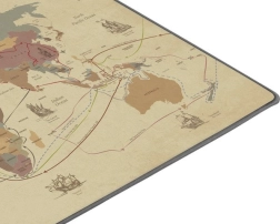 Jedinstvena grafika podloge prikazuje kartu svijeta s označenim glavnim istraživačkim rutama, što daje povijesni i edukativni element.
