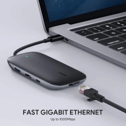 Maksimizirajte povezivost svog prijenosnika jednim priključkom. AUKEY 8‑u‑1 donosi brz USB 3.0 do 5 Gb/s, glatku sliku preko HDMI 4K@30 Hz i stabilnu mrežu zahvaljujući RJ45 10/100/1000 Mb/s. Istodobno napaja uređaje putem USB‑C PD do 100 W, pa možete raditi bez ograničenja.