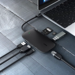 Dva čitača kartica SD i microSD olakšavaju rad s fotografijama i videom, dok trostruki USB priključci povezuju periferije i vanjske diskove. Elegantno aluminijsko kućište je izdržljivo, kompaktno i odlično odvodi toplinu – idealno za ured, home office i putovanja.