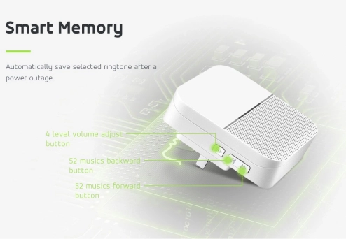 Bežična konstrukcija i kompaktne dimenzije omogućuju brzu instalaciju bez priključka na mrežu. Odaberite među 52 tonova i postavite 4 razine glasnoće za idealnu čujnost u zadanim uvjetima.
